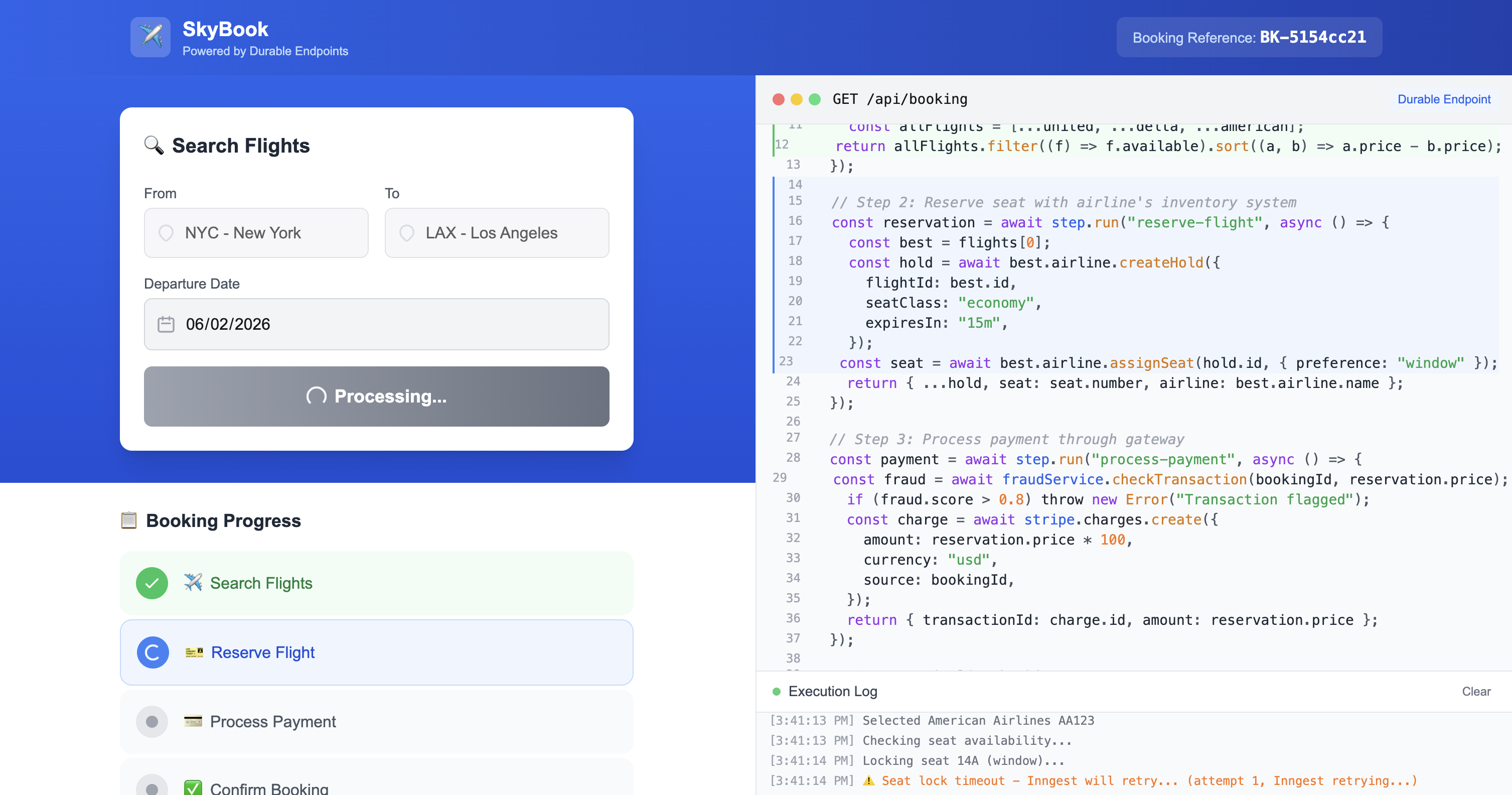This is useful when you want your endpoint to orchestrate multiple operations (like booking a flight, processing a payment, and sending a confirmation) and guarantee that each step completes exactly once, even if the handler crashes or restarts partway through. You can also stream SSE data to clients in real-time during execution.